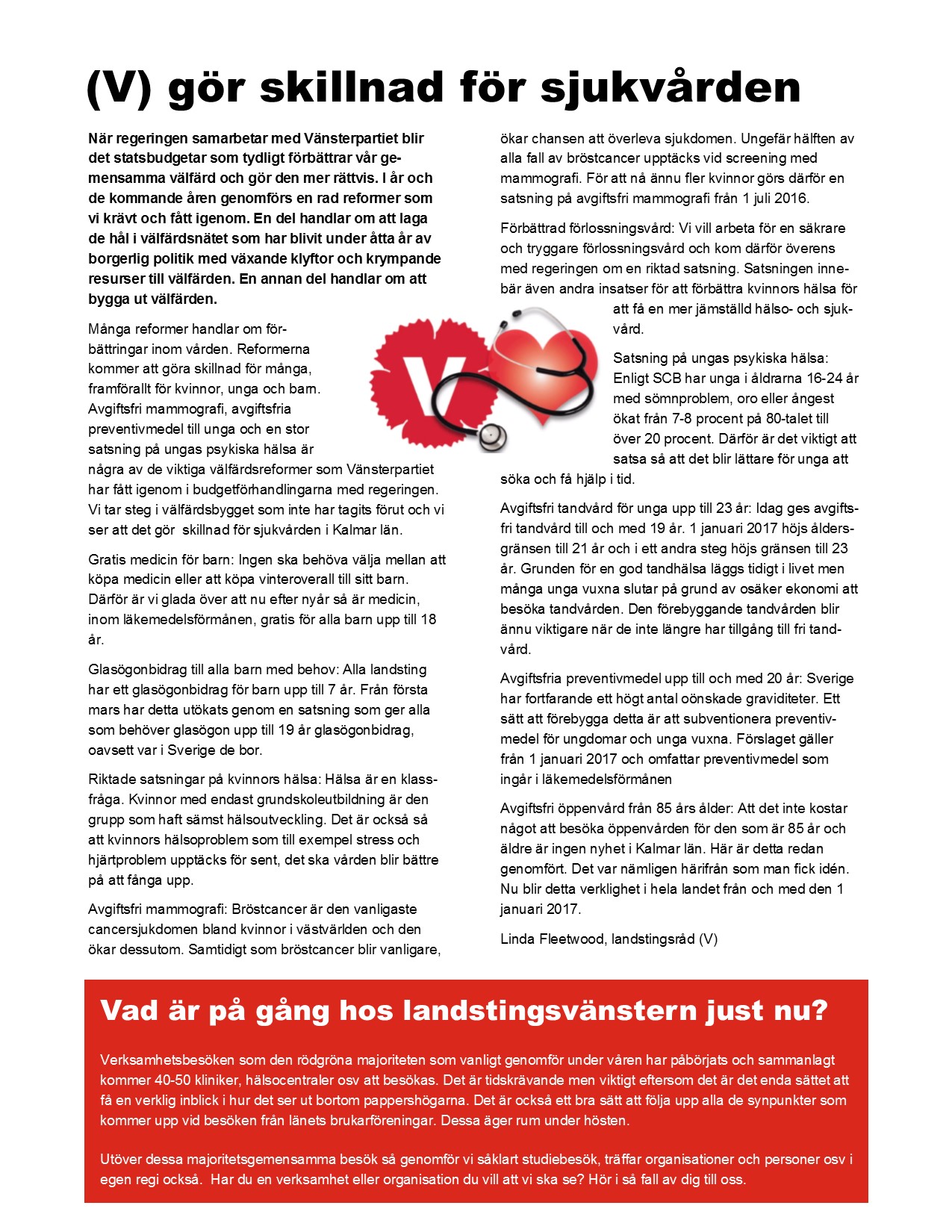 Dessutom har Vänsterpartiet i de framgångsrika förhandlingarna med regeringen fått med en satsning på kvinnors hälsa där Landstinget i Kalmar län bland annat får tre miljoner för att förstärka primärvården för de kvinnor som har sämst hälsa.
